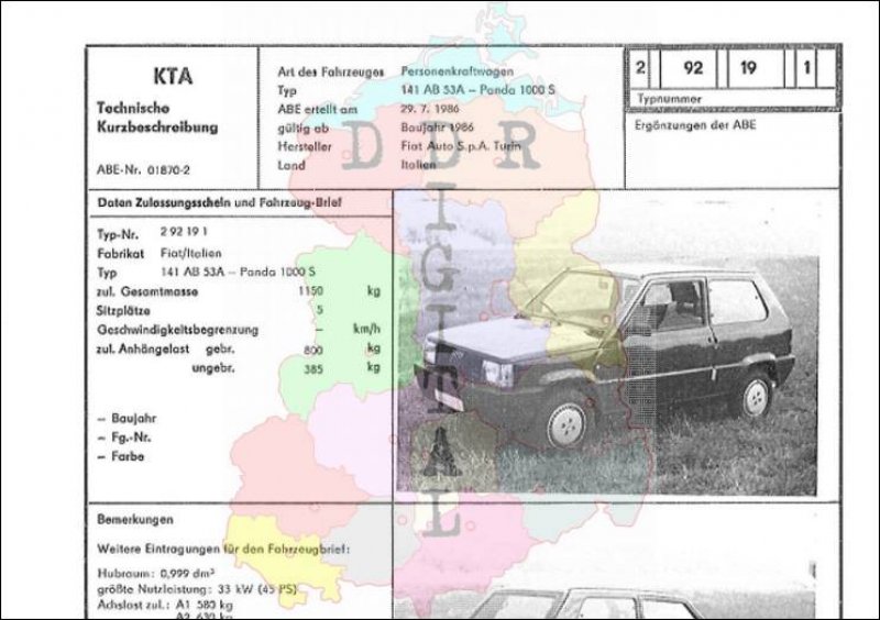 Art des Fahrzeuges: Personenkraftwagen Typ: 141 AB 53A - Panda 1000 S ABE erteilt am: 29.07.1986 gültig ab: 1986 Hersteller: Fiat Auto S.p.A. Turin Land: Italien Ergänzung zur ABE: Typnummer: 292191 Anzahl Seiten: 2