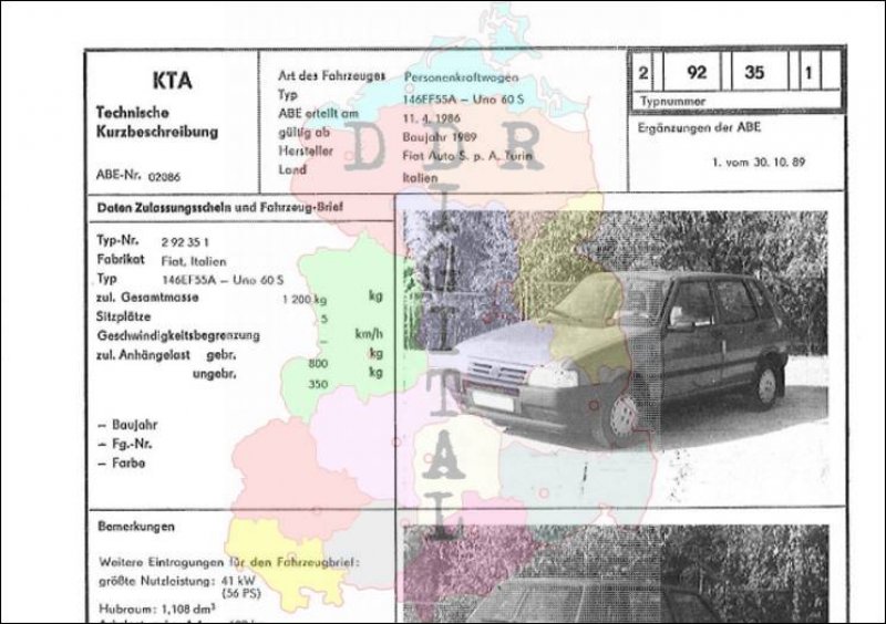 Art des Fahrzeuges: Personenkraftwagen Typ: 146EF55A - Uno 60 S ABE erteilt am: 11.04.1989 gültig ab: 1989 Hersteller: Fiat Auto S.p.A. Turin Land: Italien Ergänzung zur ABE: Typnummer: 292351 Anzahl Seiten: 2