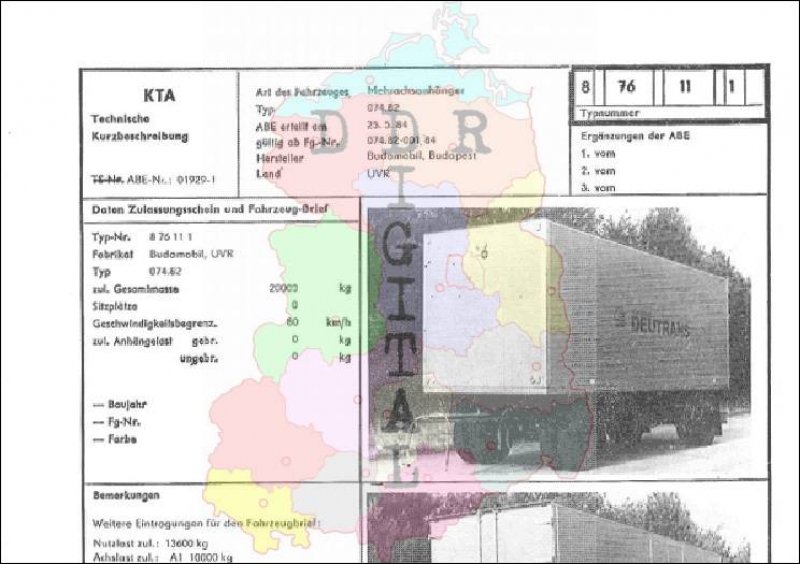 Art des Fahrzeuges: Mehrachsanhänger Typ: 074.82 ABE erteilt am: 25.05.1984 gültig ab Fg.-Nr.: 074.82-001/84 Hersteller: Budamobil, Budapest Land: Ungarische VR Ergänzung zur ABE: Typnummer 876111 Anzahl Seiten: 2