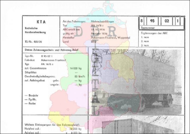 Art des Fahrzeuges: Mehrachsanhänger Typ: AA 16/8 z ABE erteilt am: 13.10.1976 gültig ab: 1976 Hersteller: Ackermann-Fruehauf, Wuppertal Land: BRD Ergänzung zur ABE: Typnummer 895021 Anzahl Seiten: 2