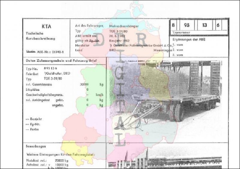 Art des Fahrzeuges: Mehrachsanhänger Typ: TUE 3-24/80 ABE erteilt am: 20.08.1982 gültig ab: 1982 Hersteller: Goldhofer Fahrzeugwerke GmbH & Co., Memmingen Land: BRD Ergänzung zur ABE: Typnummer 895136 Anzahl Seiten: 2