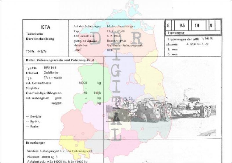Art des Fahrzeuges: Mehrachsanhänger Typ: TA 4 - 40/60 ABE erteilt am: 06.07.1976 gültig ab: 1976 Hersteller: Goldhofer Fahrzeugwerk Land: BRD Ergänzung zur ABE: 4. vom 30.03.1979 Typnummer 895144 Anzahl Seiten: 2