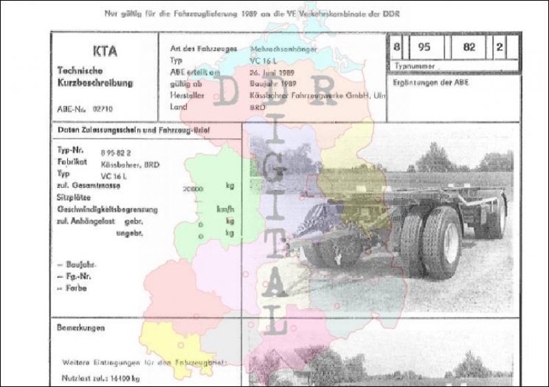 Art des Fahrzeuges: Mehrachsanhänger Typ: VC 16 L ABE erteilt am: 26.06.1989 gültig ab: 1989 Hersteller: Kässbohrer Fahrzeugwerke GmbH, Ulm Land: BRD Ergänzung zur ABE: Typnummer 895822 Anzahl Seiten: 2
