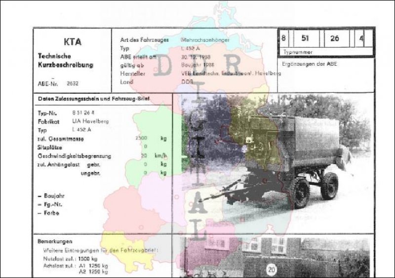 Art des Fahrzeuges: Mehrachsanhänger Typ: L 452 A ABE erteilt am: 30.12.1988 gültig ab: 1988 Hersteller: VEB Landtechn. Industrieanl. Havelberg Land: DDR Ergänzung zur ABE: Typnummer 851264 Anzahl Seiten: 2