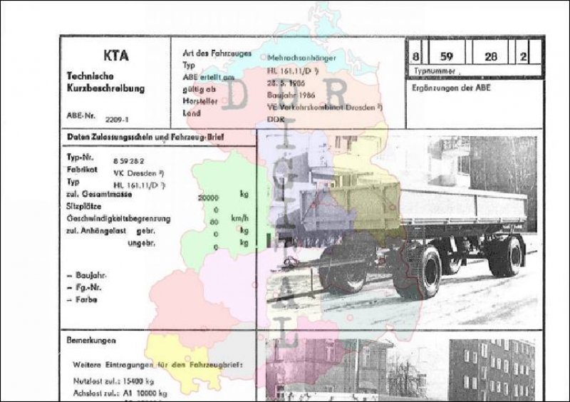 Art des Fahrzeuges: Mehrachsanhänger Typ: HL 161.11/N ABE erteilt am: 28.05.1986 gültig ab: 1986 Hersteller: VE Verkehrskombinat Dresden Land: DDR Ergänzung zur ABE: Typnummer 859282 Anzahl Seiten: 2
