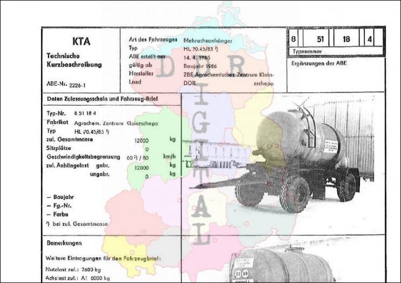 Art des Fahrzeuges: Mehrachsanhänger Typ: HW 70.45/83 ABE erteilt am: 14.04.1986 gültig ab: 1986 Hersteller: ZBE Agrochemisches Zentrum Kleinzschepa Land: DDR Ergänzung zur ABE: Typnummer 851184 Anzahl Seiten: 2
