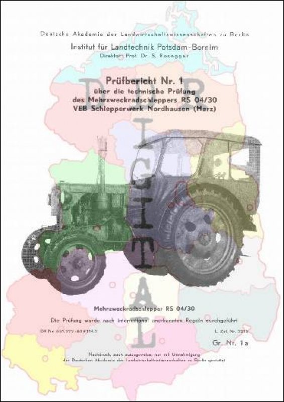 Prüfbericht Nr.: 1 Prüfstelle:: Institut für Landtechnik Potsdam-Bornim Hersteller:: VEB Schlepperwerk Nordhausen Prüfgegenstand RS 04/30 Prüfdatum: 24. Januar 1956 Anzahl Seiten: 18