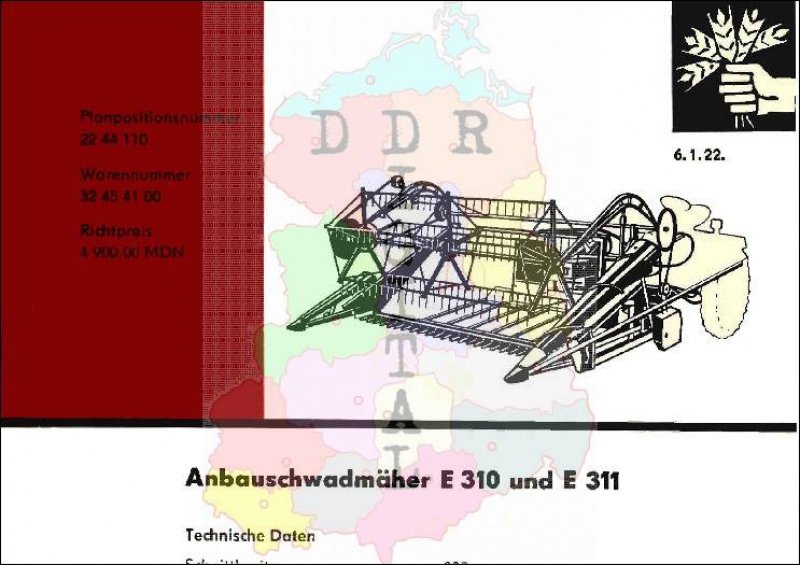 Herausgeber: VVB Landmaschinen- und Traktornbau Leipzig Entwicklungsr- und Herstellerbetrieb: VEB "Fortschritt" Erntebergungsmaschinen Neustadt / Sa. Anzahl Seiten: 2 In dem Landmaschinen-Katalog sind Maschinen und Geräte enthalten, welche zur weiteren Mechanisierung in der sozialistischen Landwirtschaft bestimmt waren. Dieser Katalog sollte die Genossenschaften bei der Planung neuer Technik für ihren Betrieb unterstützen.