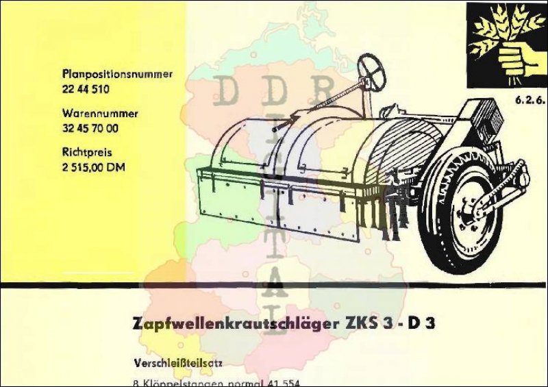 Herausgeber: VVB Landmaschinen- und Traktornbau Leipzig Entwicklungsrbetrieb: VEB Bodenbearbeitungsgeräte Leipzig Herstellerbetrieb: VEB (B) Apparate- und Maschinenfabrik Teterow Anzahl Seiten: 2 In dem Landmaschinen-Katalog sind Maschinen und Geräte enthalten, welche zur weiteren Mechanisierung in der sozialistischen Landwirtschaft bestimmt waren. Dieser Katalog sollte die Genossenschaften bei der Planung neuer Technik für ihren Betrieb unterstützen.