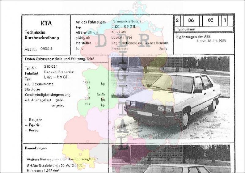Art des Fahrzeuges: Personenkraftwagen Typ: L 423-R 9 GTL ABE erteilt am: 03.01.1985 gültig ab: 1986 Hersteller: Regie Nationale des Usines Renault Land: Frankreich Ergänzung zur ABE: 1. vom 18.11.85 Typnummer: 286031 Anzahl Seiten: 2