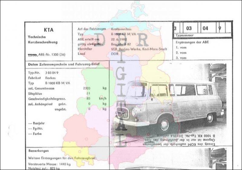 Art des Fahrzeuges: Kraftomnibus Typ: B 1000 KB M VA ABE erteilt am: 22.06.1982 gültig ab: 1982 Hersteller: VEB Barkas-Werke Karl-Marx-Stadt Land: DDR Ergänzung zur ABE: Typnummer: 303049 Anzahl Seiten: 2