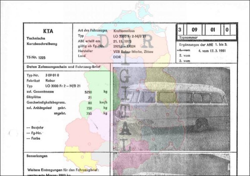 Art des Fahrzeuges: Kraftomnibus Typ: LO 3000 - Fr 2-M / B 21 ABE erteilt am: 21.11.1973 gültig ab Fg.-Nr.: 29213 - 17024 Hersteller: VEB Robur-Werke Zittau Land: DDR Ergänzung zur ABE: 4. vom 17.03.1981 Typnummer: 309010 Anzahl Seiten: 2
