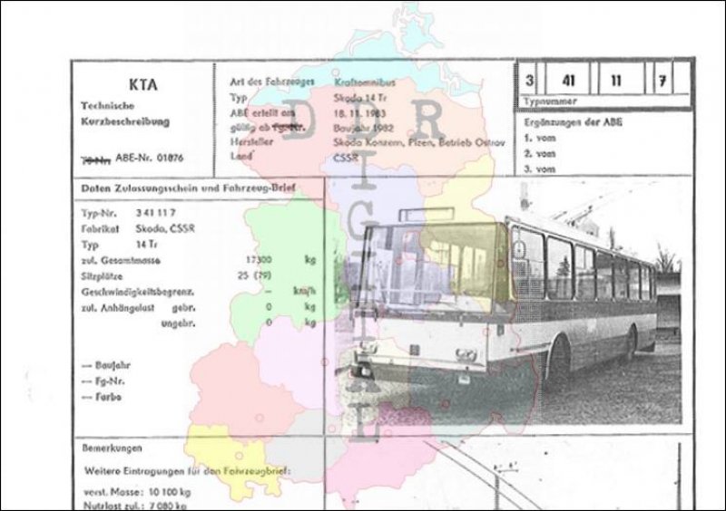 Art des Fahrzeuges: Kraftomnibus Typ: Skoda 14 Tr ABE erteilt am: 18.11.1983 gültig ab: 1982 Hersteller: Skoda Konzern, Plzen, Betrieb Ostrov Land: CSSR Ergänzung zur ABE: Typnummer: 341117 Anzahl Seiten: 2