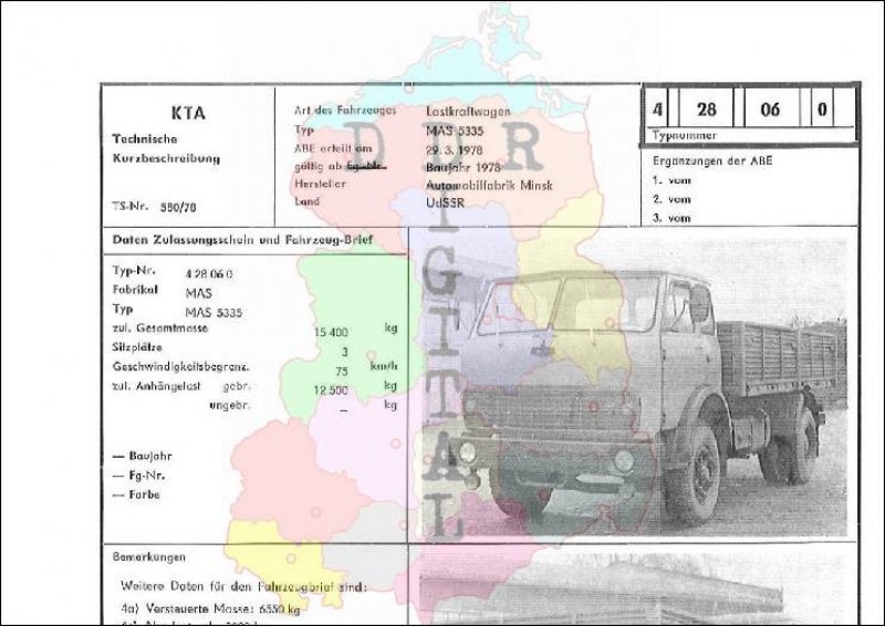 Art des Fahrzeuges: Lastkraftwagen Typ: MAS 5335 ABE erteilt am: 29.03.1978 gültig ab: 1978 Hersteller: Automobilwerk Minsk Land: UdSSR Ergänzung zur ABE: Typnummer: 428060 Anzahl Seiten: 2