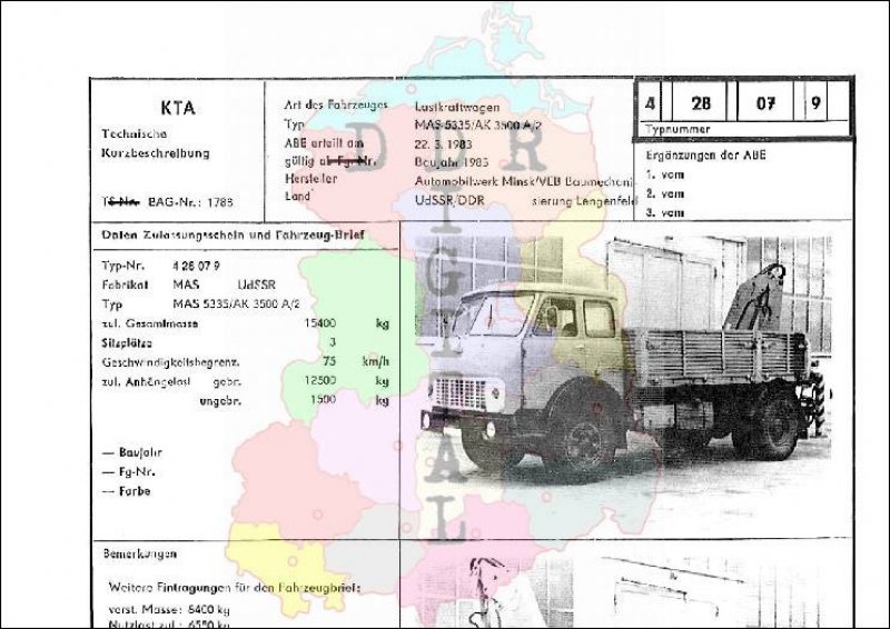 Art des Fahrzeuges: Lastkraftwagen Typ: MAS 5335/AK 3500 A/2 ABE erteilt am: 22.03.1983 gültig ab: 1983 Hersteller: Automobilfabrik Minsk / VEB Baumechanisierung Lengenfeldt Land: UdSSR/DDR Ergänzung zur ABE: Typnummer: 428079 Anzahl Seiten: 2