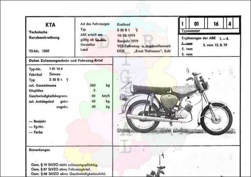 Art des Fahrzeuges: Kraftrad Typ: S 50 B 1 ABE erteilt am: 14.12.1974 gültig ab: 1974 Hersteller: VEB Fahrzeug- und Jagdwaffenwerk "Ernst Thälmann" Suhl Land: DDR Ergänzung zur ABE: Typnummer: 101164 Anzahl Seiten: 2