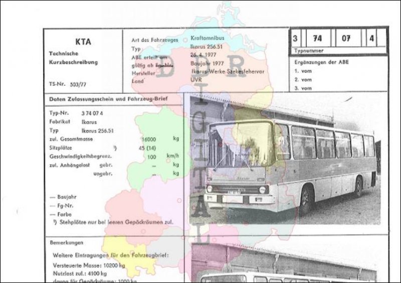 Art des Fahrzeuges: Kraftomnibus Typ: Ikarus 256.51 ABE erteilt am: 26.04.1977 gültig ab: 1977 Hersteller: Ikarus-Werke, Szekesfehervar Land: Ungarische Volksrepublik Ergänzung zur ABE: Typnummer: 374074 Anzahl Seiten: 2