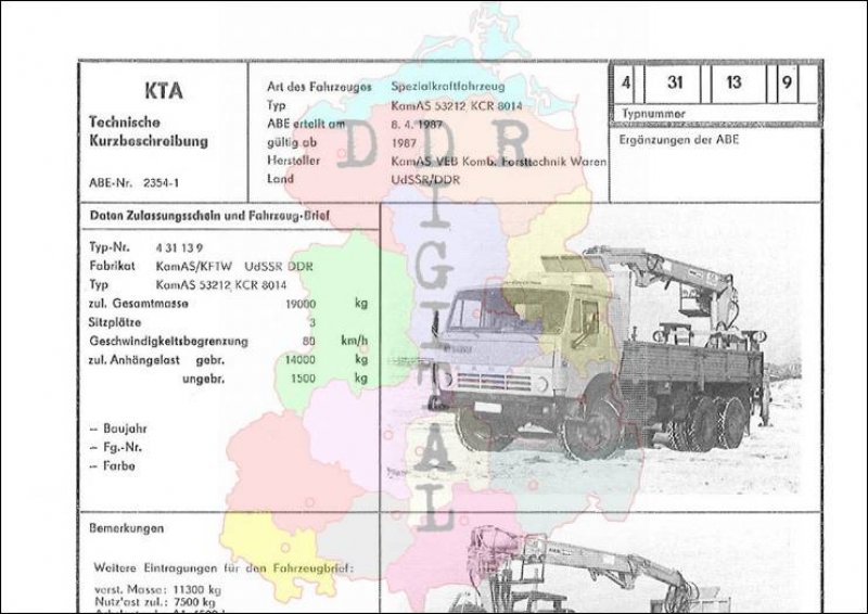 Art des Fahrzeuges: Lastkraftwagen Typ: KamAS 53212/KCR 8014 ABE erteilt am: 08.04.1987 gültig ab: 1987 Hersteller: KamAS, VEB Komb. Fortschritt Waren Land: UdSSR/DDR Ergänzung zur ABE: Typnummer: 431139 Anzahl Seiten: 2