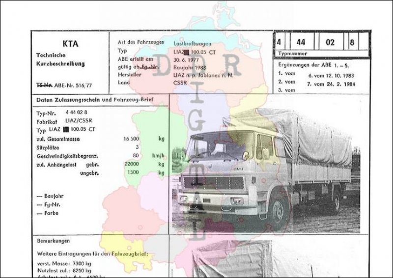 Art des Fahrzeuges: Lastkraftwagen Typ: LIAZ 100.05 CT ABE erteilt am: 30.06.1977 gültig ab: 1983 Hersteller: LIAZ n. p. Jablonec n. N. Land: CSSR Ergänzung zur ABE: 7. vom 24.02.1984 Typnummer: 444028 Anzahl Seiten: 2