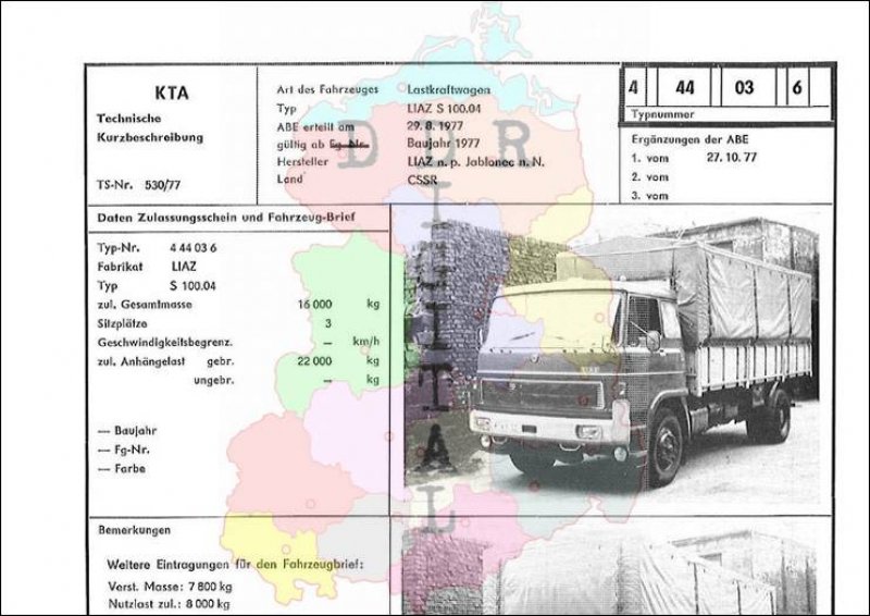 Art des Fahrzeuges: Lastkraftwagen Typ: LIAZ S 100.04 ABE erteilt am: 29.08.1977 gültig ab: 1977 Hersteller: LIAZ n. p. Jablonec n. N. Land: CSSR Ergänzung zur ABE: 1. vom 27.10.1977 429020 444036 Anzahl Seiten: 2