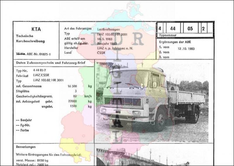 Art des Fahrzeuges: Lastkraftwagen Typ: LIAZ 100.02/HR 3001 ABE erteilt am: 18.05.1983 gültig ab: 1983 Hersteller: LIAZ n. p. Jablonec n. N. Land: CSSR Ergänzung zur ABE: 1. vom 12.10.1983 Typnummer: 444052 Anzahl Seiten: 2