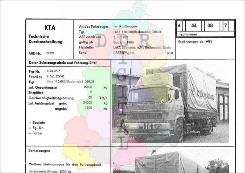 Art des Fahrzeuges: Lastkraftwagen Typ: LIAZ 110.080/Budamobil 030.04 ABE erteilt am: 05.01.1987 gültig ab: 1986 Hersteller: Liaz, Jablonec n. N., Budamobil, Budapest Land: CSSR/Ungarn Ergänzung zur ABE: Typnummer: 444087 Anzahl Seiten: 2