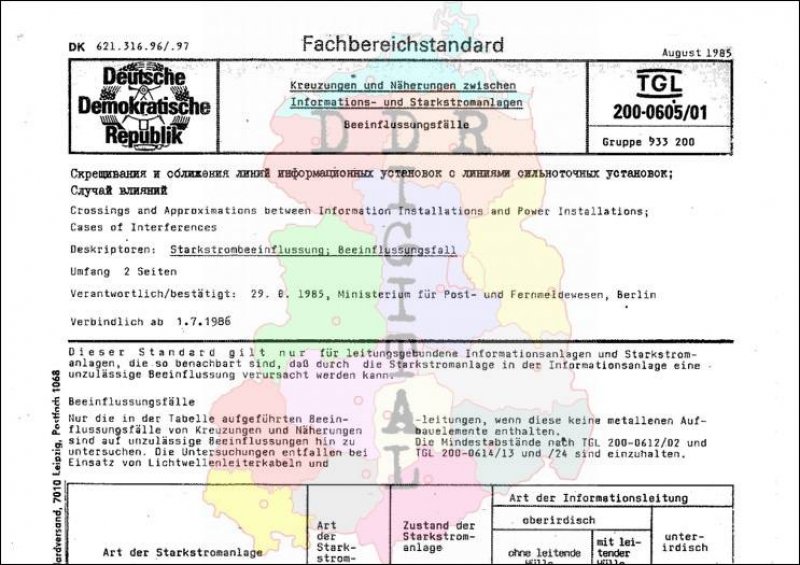 Standard: Fachbereichstandard Ausgabe: August 1985 verbindlich ab: 01.07.1986 Verantwortlich: Ministerium für Post- und Fernmeldewesen bestätigt am: 29.08.1985 Bestätigt von: Ministerium für Post- und Fernmeldewesen Anzahl Seiten: 2