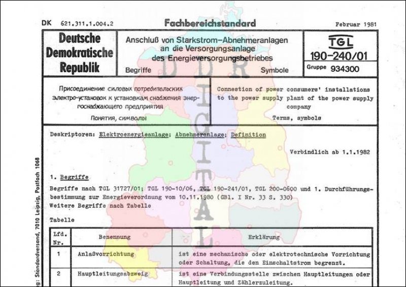 Standard: Fachbereichstandard Ausgabe: Februar 1981 verbindlich ab: 01.01.1982 Verantwortlich: VE Kombinat Verbundnetze Energie Berlin bestätigt am: 27.02.1981 Bestätigt von: VE Kombinat Verbundnetze Energie Berlin Anzahl Seiten: 4