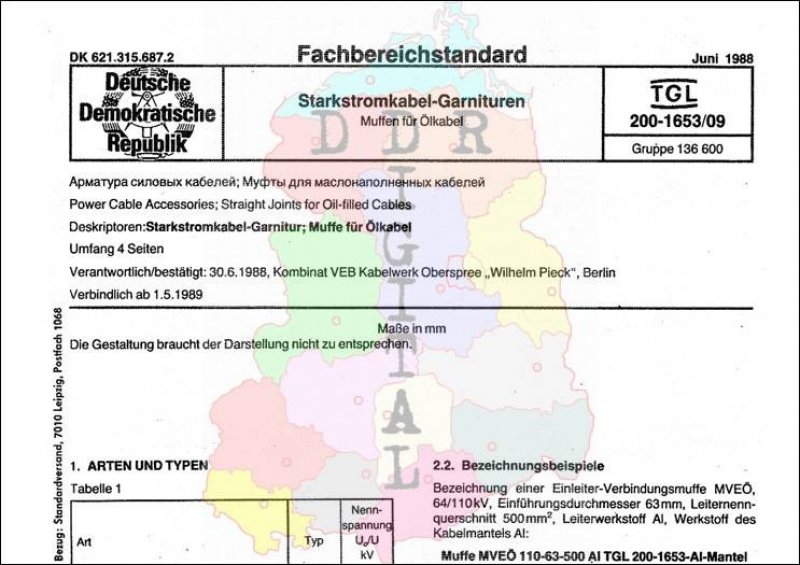 Standard: Fachbereichstandard Ausgabe: Juni 1988 verbindlich ab: 01.05.1989 Verantwortlich: Kombinat VEB Kabelwerk Oberspree Wilhelm Pieck Berlin bestätigt am: 30.06.1988 Bestätigt von: Kombinat VEB Kabelwerk Oberspree Wilhelm Pieck Berlin Anzahl Seiten: 4