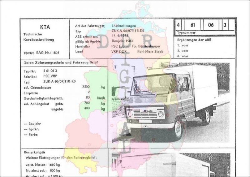 Art des Fahrzeuges: Lastkraftwagen Typ: ZUK A-06/07/11B-K0 ABE erteilt am: 14.04.1983 gültig ab: 1983 Hersteller: FSC Lublin / Fa. Gerstenberger Karl-Marx-Stadt Land: VR Polen / DDR Ergänzung zur ABE: Typnummer: 461063 Anzahl Seiten: 2