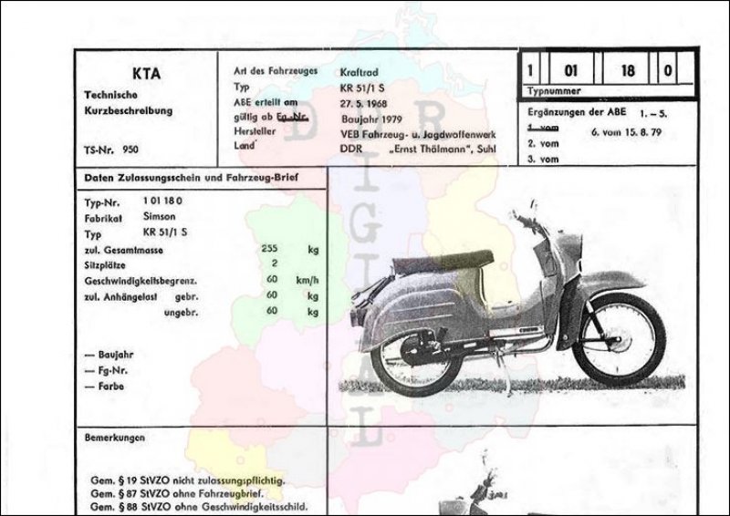 Art des Fahrzeuges: Kraftrad Typ: KR 51/1 S ABE erteilt am: 27.05.1968 gültig ab: 1968 Hersteller: VEB Fahrzeug- und Jagdwaffenwerk "Ernst Thälmann" Suhl Land: DDR Ergänzung zur ABE: 6. vom 15.08.1979 Typnummer: 101180 Anzahl Seiten: 2