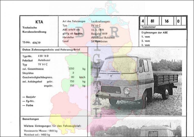 Art des Fahrzeuges: Lastkraftwagen Typ: TV 14 C ABE erteilt am: 15.03.1979 gültig ab: 1979 Hersteller: Autobuzul Bukarest Land: SR Rumänien Ergänzung zur ABE: Typnummer: 481160 Anzahl Seiten: 2