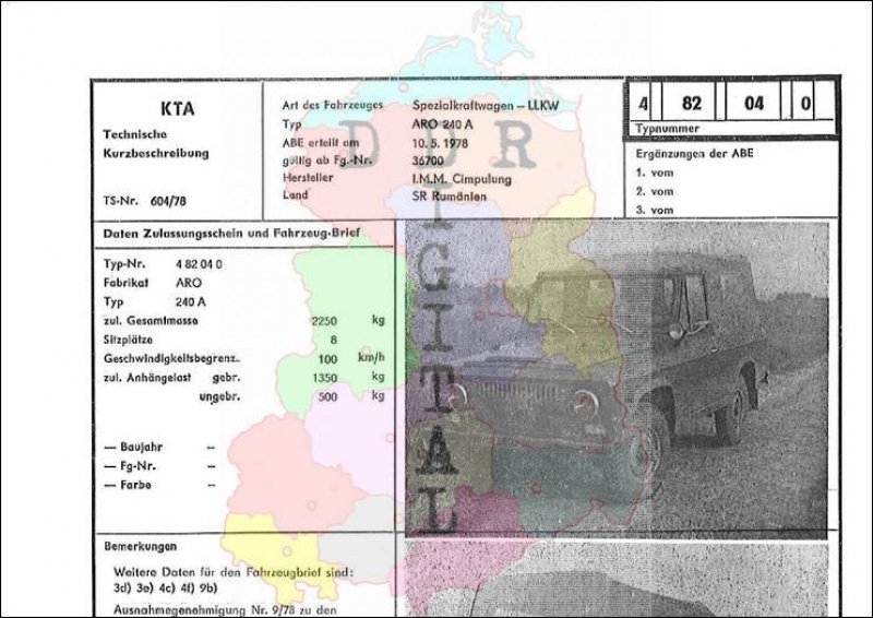 Art des Fahrzeuges: Spezialkraftwagen LLKW Typ: ARO 240 A ABE erteilt am: 10.05.1978 gültig ab Fahrgestellnr.: 36700 Hersteller: I.M.M. Cimpulung Land: SR Rumänien Ergänzung zur ABE: Typnummer: 482040 Anzahl Seiten: 2