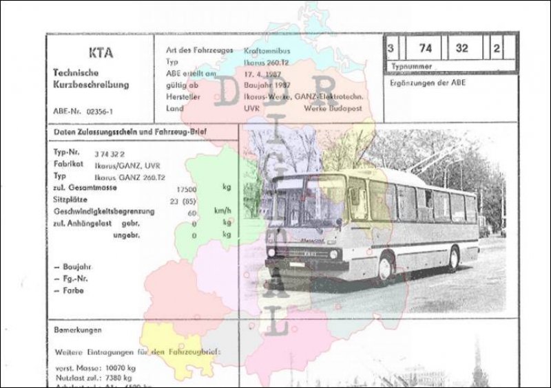 Art des Fahrzeuges: Kraftomnibus Typ: Ikarus 260. T2 ABE erteilt am: 17.04.1987 gültig ab: 1987 Hersteller: Ikarus-Werke, GANZ Land: Ungarische Volksrepublik Ergänzung zur ABE: Typnummer: 374322 Anzahl Seiten: 2