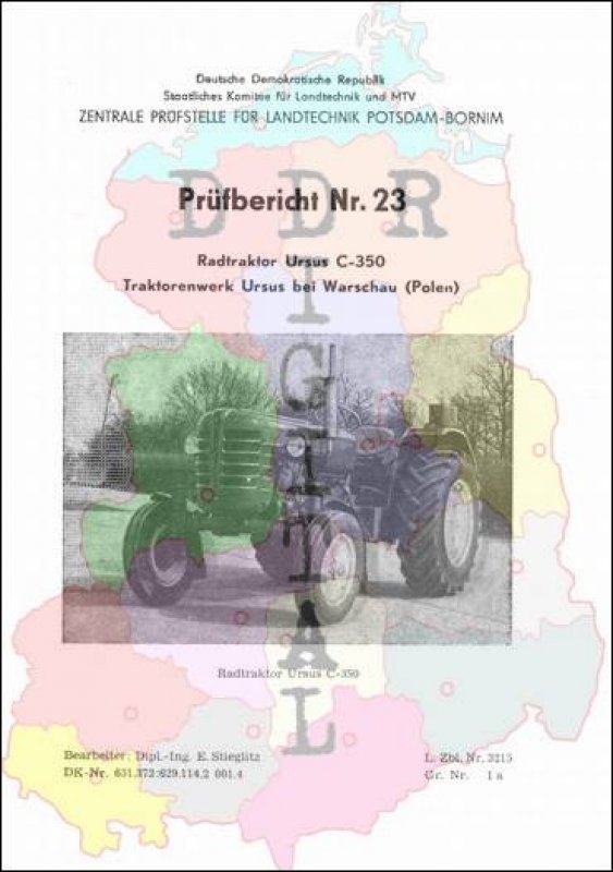 Prüfbericht Nr.: 23 Prüfstelle:: Zentrale Prüfstelle für Landtechnik Potsdam-Bornim Hersteller:: Traktorenwerk Ursus bei Warschau Prüfgegenstand Radtraktor Ursus C-350 Prüfdatum: 1.4.1969 Anzahl Seiten: 32