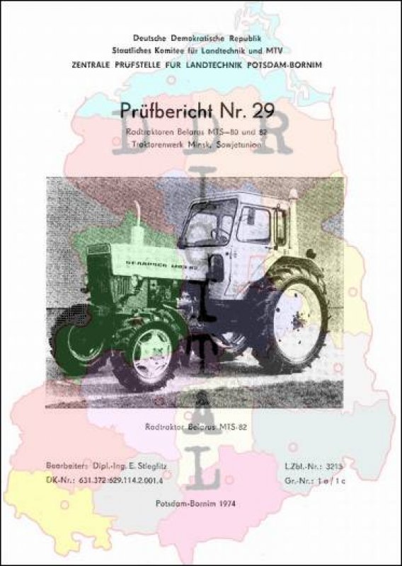 Prüfbericht Nr.: 29 Prüfstelle:: Zentrale Prüfstelle für Landtechnik Potsdam-Bornim Hersteller:: Minsker Traktorenwerk Prüfgegenstand Radtraktor Belarus MTS-80 und 82 Prüfdatum: 31.1.1974 Anzahl Seiten: 40