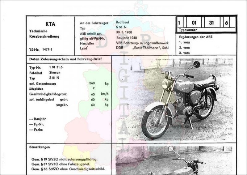 Art des Fahrzeuges: Kraftrad Typ: S 51 N ABE erteilt am: 30.05.1980 gültig ab: 1980 Hersteller: VEB Fahrzeug- und Jagdwaffenwerk "Ernst Thälmann" Suhl Land: DDR Ergänzung zur ABE: Typnummer: 101316 Anzahl Seiten: 2