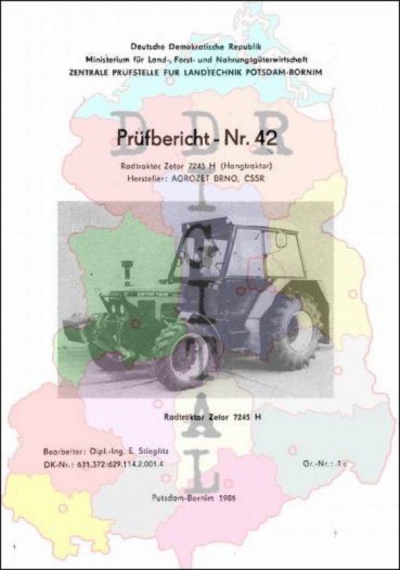 Prüfbericht Nr.: 42 Prüfstelle:: Zentrale Prüfstelle für Landtechnik Potsdam-Bornim Hersteller:: Agrozet-Zetor Brno Prüfgegenstand Radtraktor Zetor 7245 H (Hangtraktor) Prüfdatum: 4.3.86 Anzahl Seiten: 44