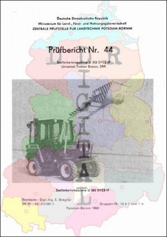 Prüfbericht Nr.: 44 Prüfstelle:: Zentrale Prüfstelle für Landtechnik Potsdam-Bornim Hersteller:: Universal Traktor Brasov Prüfgegenstand Stallarbeitsmaschine U 302 DTCE-IF Prüfdatum: 26.4.1988 Anzahl Seiten: 36