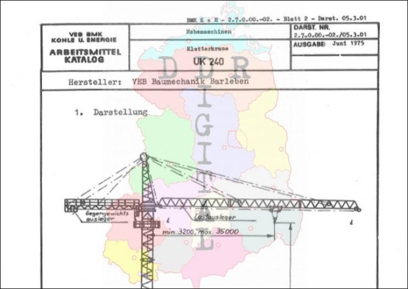 Kletterkrane: UK 240 Hersteller: VEB Baumechanik Barleben Ausgabe: Juni 1975 Anzahl Seiten: 10 Notiz: