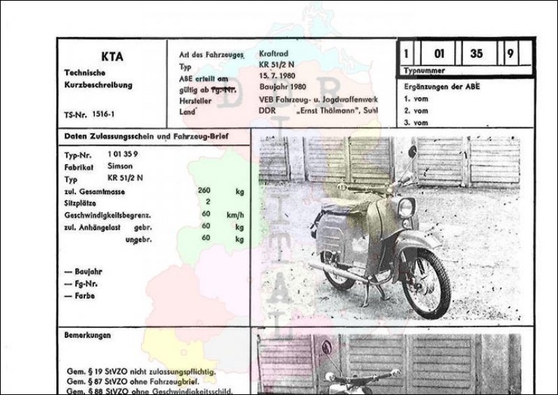 Art des Fahrzeuges: Kraftrad Typ: KR 51/2 N ABE erteilt am: 15.07.1980 gültig ab: 1980 Hersteller: VEB Fahrzeug- und Jagdwaffenwerk "Ernst Thälmann" Suhl Land: DDR Ergänzung zur ABE: Typnummer: 101359 Anzahl Seiten: 2