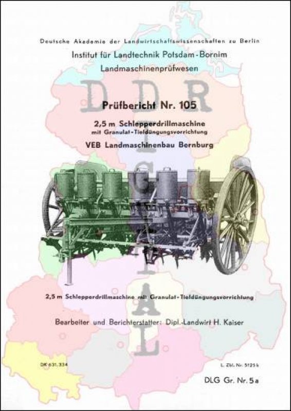 Prüfbericht Nr.: 105 Prüfstelle:: Institut für Landtechnik Potsdam-Bornim Hersteller:: VEB Landmaschinenbau Bernburg Prüfgegenstand 2,5 m Schlepperdrillmaschine mit Granulat-Tiefdüngungsvorrichtung Prüfdatum: 13. Dezember 1955 Anzahl Seiten: 10