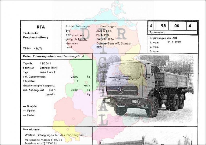 Art des Fahrzeuges: Lastkraftwagen Typ: 2626 K 6 x 4 ABE erteilt am: 22.04.1976 gültig ab: 1976 Hersteller: Daimler-Benz AG, Stuttgart Land: BRD Ergänzung zur ABE: 1. vom 30.01.1979 Typnummer: 495044 Anzahl Seiten: 2