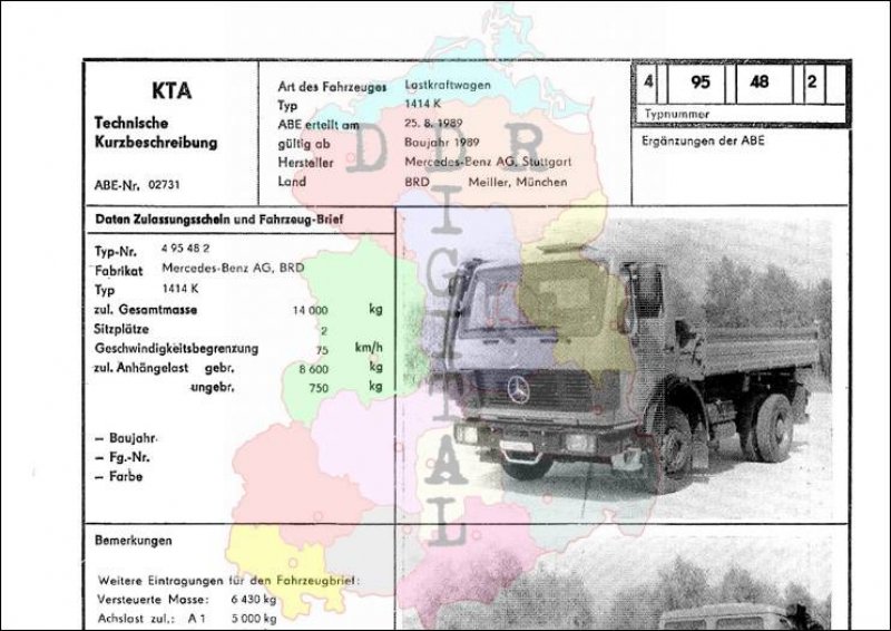 Art des Fahrzeuges: Lastkraftwagen Typ: 1414 K ABE erteilt am: 25.08.1989 gültig ab: 1989 Hersteller: Mercedes-Benz AG Stuttgart Land: BRD Ergänzung zur ABE: Typnummer: 495482 Anzahl Seiten: 2