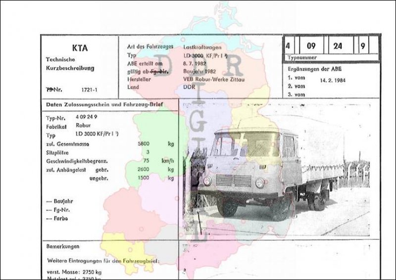 Art des Fahrzeuges: Lastkraftwagen Typ: LD 3001 KF/Pr I ABE erteilt am: 08.07.1982 gültig ab: 1982 Hersteller: VEB Robur-Werke Zittau Land: DDR Ergänzung zur ABE: 1. vom 14.02.1984 Typnummer: 409249 Anzahl Seiten: 2
