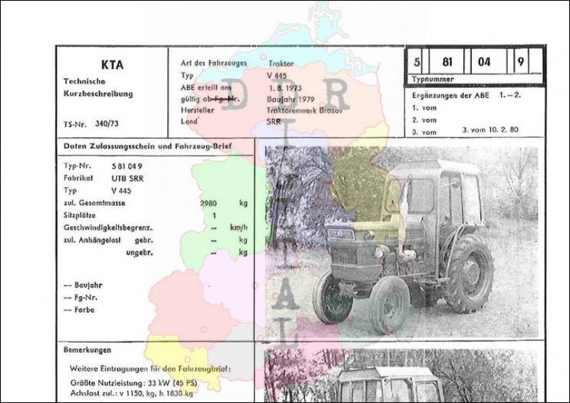 Art des Fahrzeuges: Traktor Typ: V 445 ABE erteilt am: 01.08.1973 gültig ab: 1979 Hersteller: Traktorenwerk Brasov Land: SR Rumänien Ergänzung zur ABE: 3. vom 10.02.1980 Typnummer: 581049 Anzahl Seiten: 3