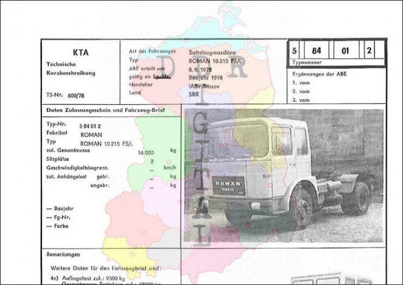 Art des Fahrzeuges: Sattelzugmaschine Typ: ROMAN 10.215 FS/L ABE erteilt am: 08.09.1978 gültig ab: 1978 Hersteller: IABv Brasov Land: SR Rumänien Ergänzung zur ABE: Typnummer: 584012 Anzahl Seiten: 2