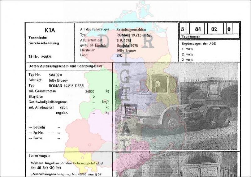 Art des Fahrzeuges: Sattelzugmaschine Typ: ROMAN 19.215 DFS/L ABE erteilt am: 08.09.1978 gültig ab: 1978 Hersteller: IABv Brasov Land: SR Rumänien Ergänzung zur ABE: Typnummer: 584020 Anzahl Seiten: 2