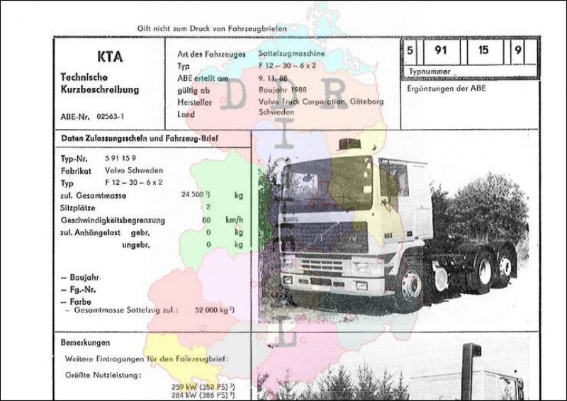 Art des Fahrzeuges: Sattelzugmaschine Typ: F 12 - 30 - 6 x 2 ABE erteilt am: 09.11.1988 gültig ab: 1988 Hersteller: Volvo Truck Corporation Göteborg Land: Schweden Ergänzung zur ABE: Typnummer: 591159 Anzahl Seiten: 2