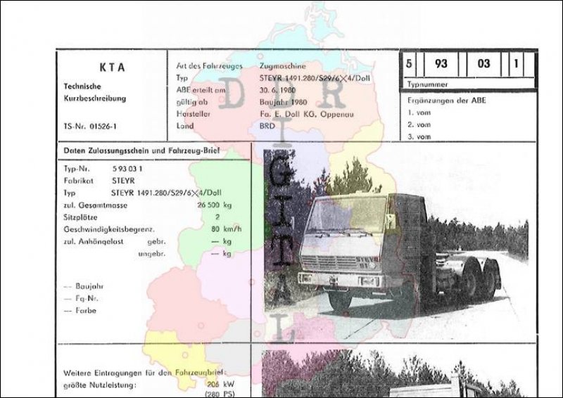 Art des Fahrzeuges: Zugmaschine Typ: Steyr 1491.280/S29/6x4/Doll ABE erteilt am: 30.06.1980 gültig ab: 1980 Hersteller: Fa. E. Doll KG Oppenau Land: BRD Ergänzung zur ABE: Typnummer: 593031 Anzahl Seiten: 2